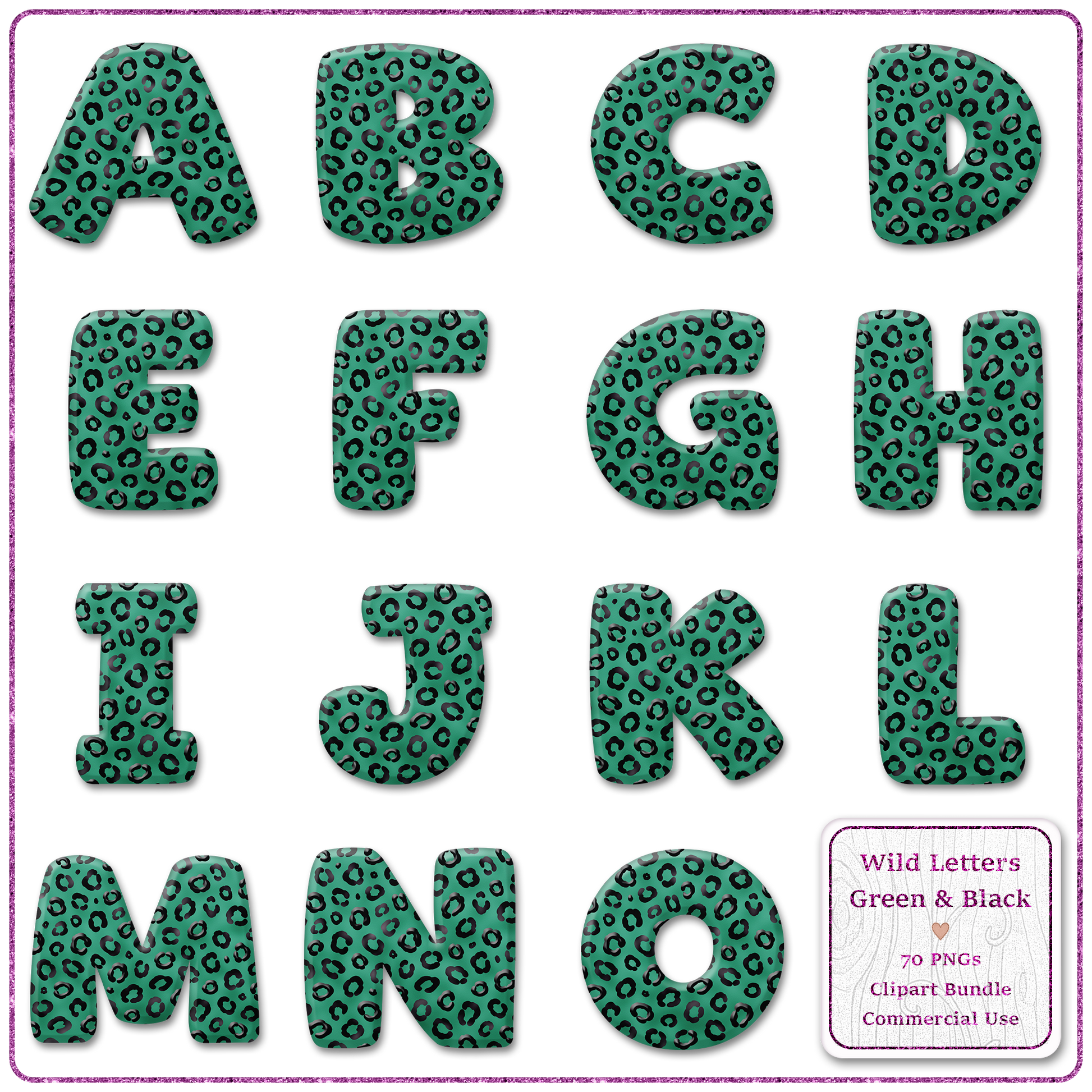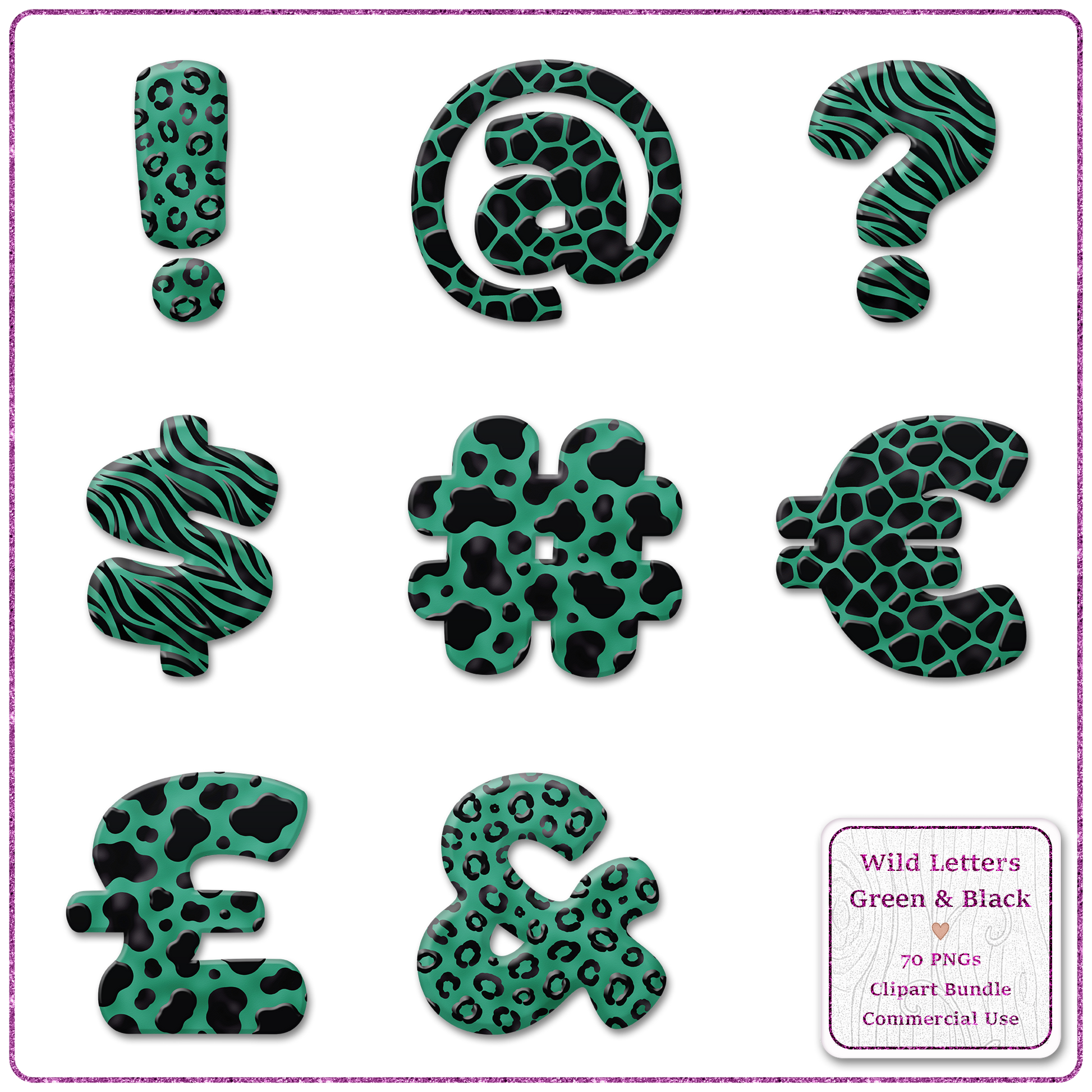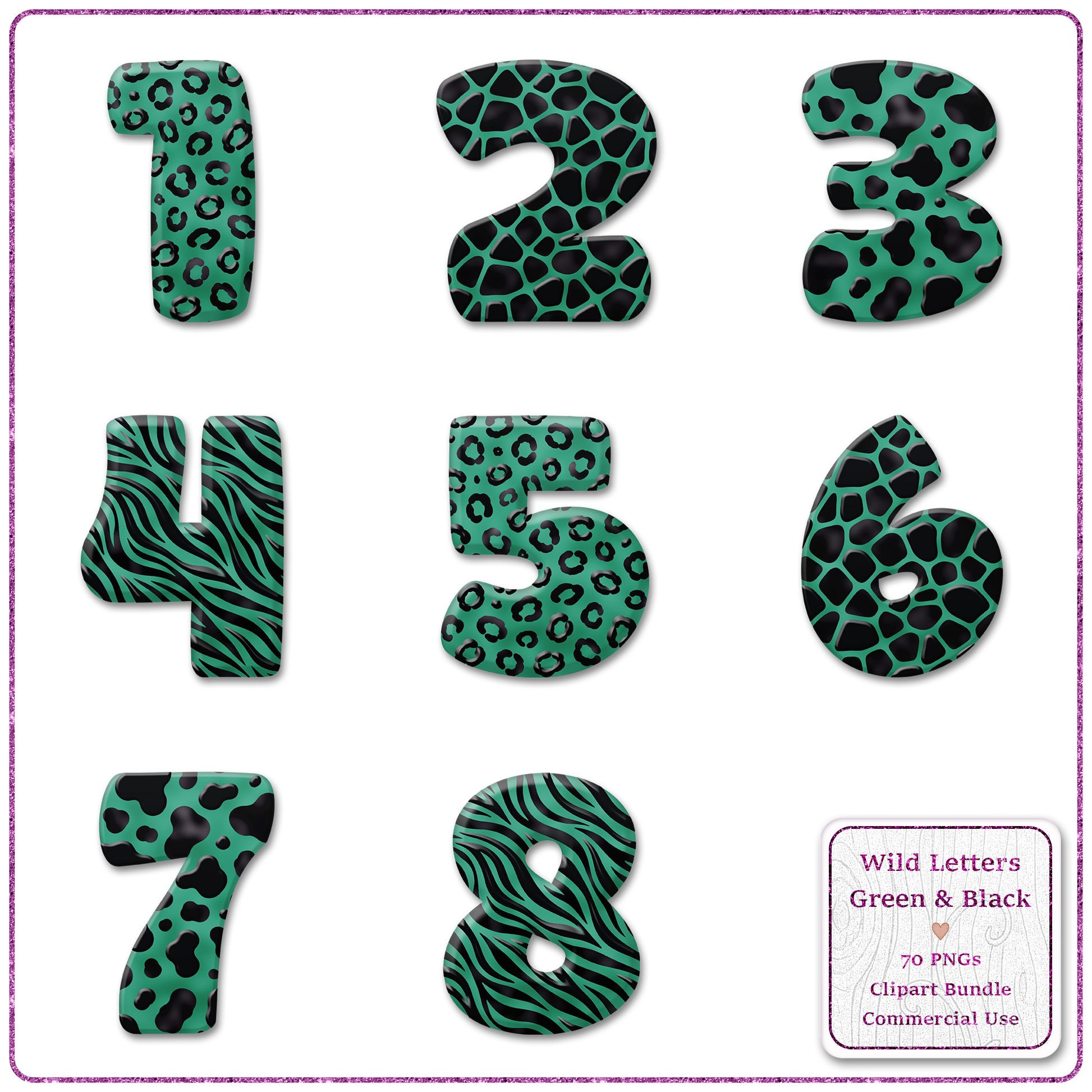 Make your designs stand out with this bold and stylish Green Animal Print Letters & Numbers Clipart Pack.