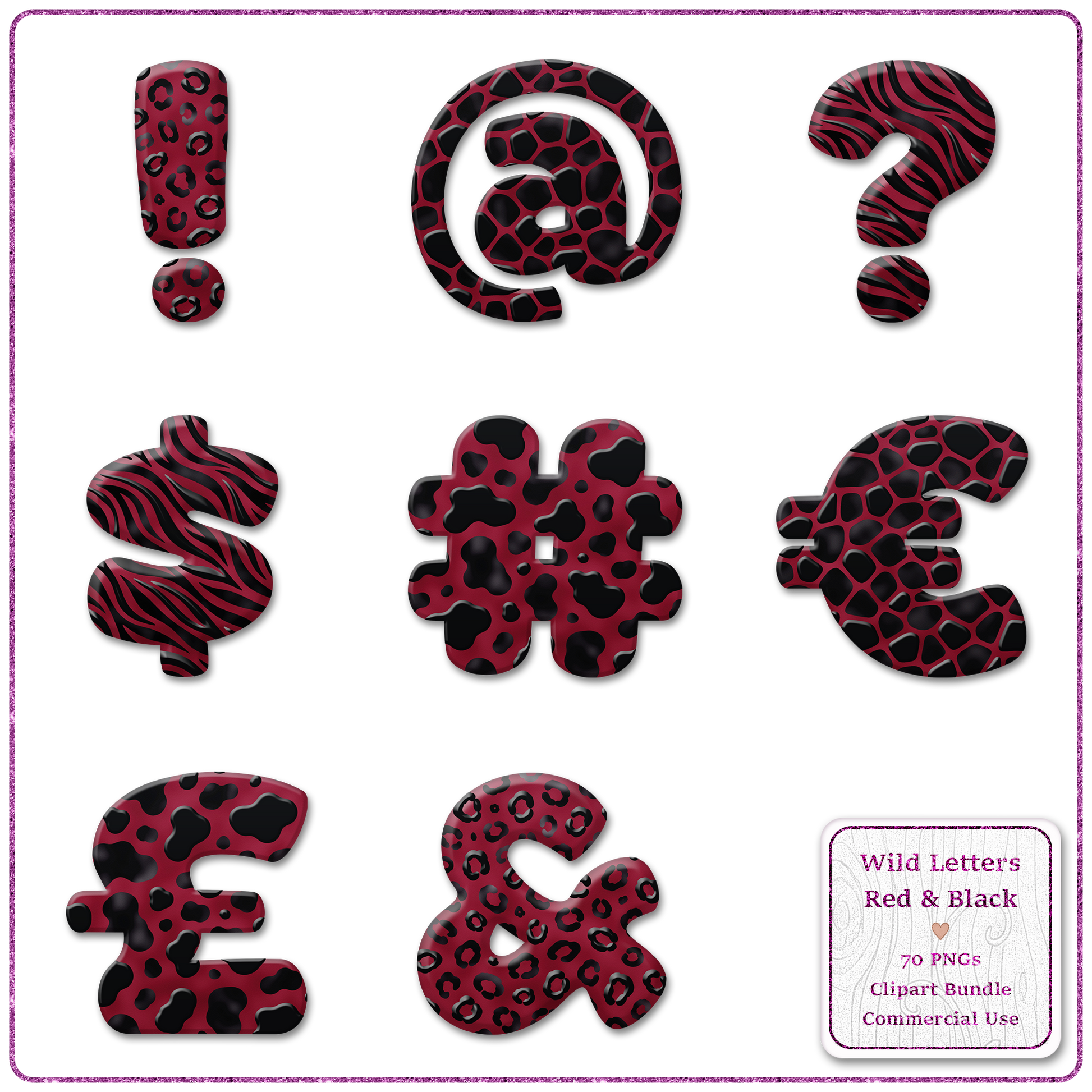This eye-catching collection features a full alphabet, numbers, and symbols in striking red and black wild prints including leopard, zebra, and abstract animal patterns.